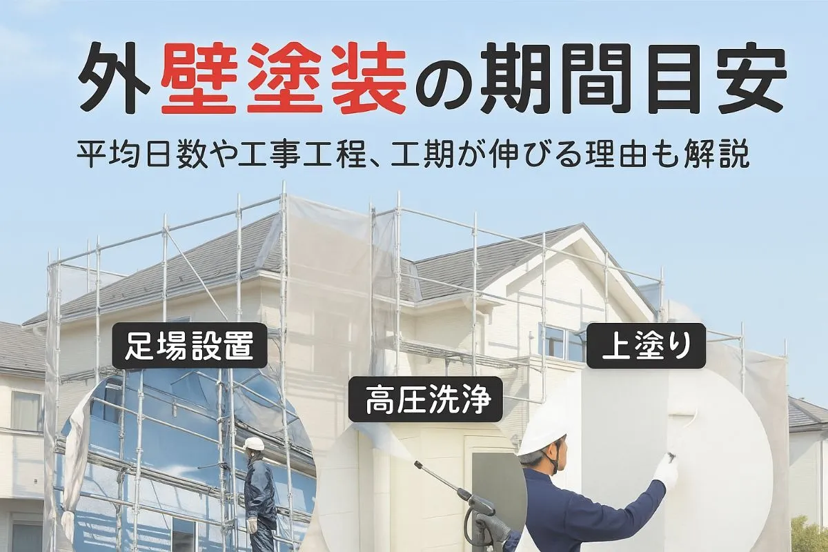 工事内容や建物の規模、足場の設置や撤去の難易度、高圧洗浄の必要性なども工期に影響します。特に屋根塗装と同時に行う場合や、アパート・マンションなど規模が大きい建物では2週間以上かかることもあります。実際にかかる日数は見積もり時にしっかり確認しましょう。